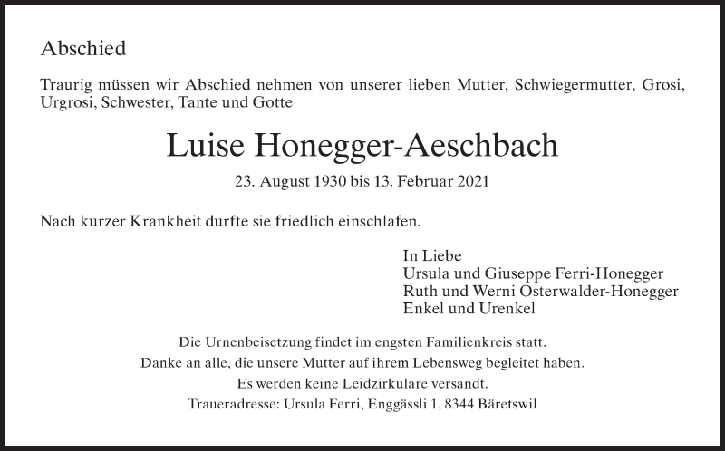 Hier finden Sie alle Traueranzeigen aus der Zeitung, die bisher für Luise Honegger-Aeschbach erschienen sind. Weitere Traueranzeigen, die in der Zeitung erscheinen, werden hier ebenfalls aufgelistet