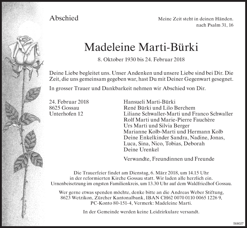 Hier finden Sie alle Traueranzeigen aus der Zeitung, die bisher für Madeleine Marti-Bürki erschienen sind. Weitere Traueranzeigen, die in der Zeitung erscheinen, werden hier ebenfalls aufgelistet