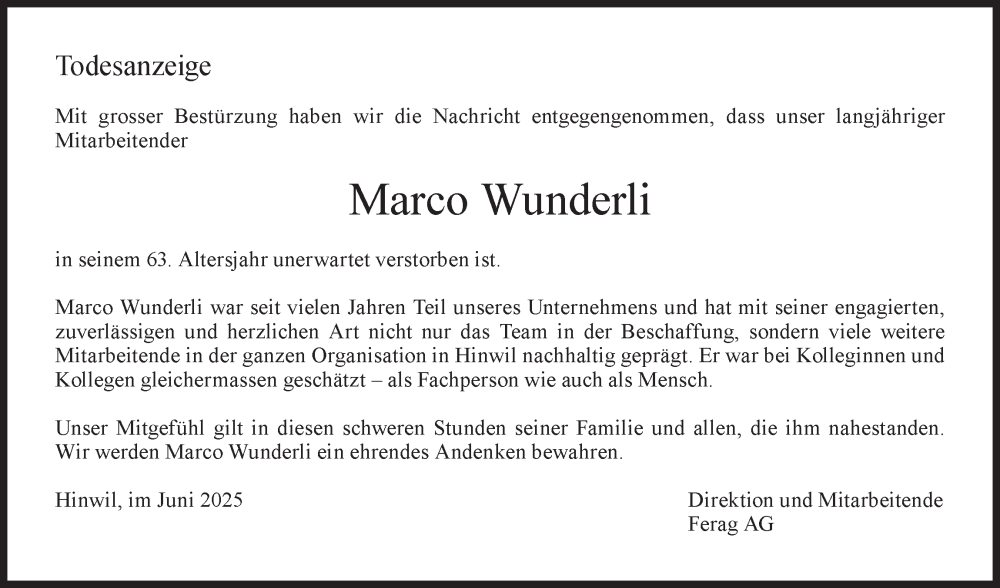 Hier finden Sie alle Traueranzeigen aus der Zeitung, die bisher für Marco Wunderli erschienen sind. Weitere Traueranzeigen, die in der Zeitung erscheinen, werden hier ebenfalls aufgelistet