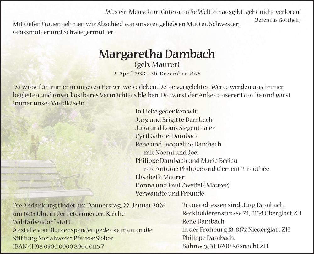 Hier finden Sie alle Traueranzeigen aus der Zeitung, die bisher für Margaretha Dambach erschienen sind. Weitere Traueranzeigen, die in der Zeitung erscheinen, werden hier ebenfalls aufgelistet