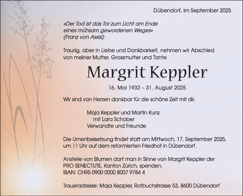 Hier finden Sie alle Traueranzeigen aus der Zeitung, die bisher für Margrit Keppler erschienen sind. Weitere Traueranzeigen, die in der Zeitung erscheinen, werden hier ebenfalls aufgelistet