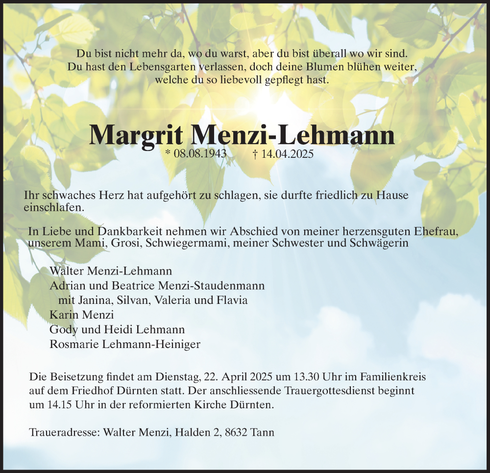 Hier finden Sie alle Traueranzeigen aus der Zeitung, die bisher für Margrit Menzi-Lehmann erschienen sind. Weitere Traueranzeigen, die in der Zeitung erscheinen, werden hier ebenfalls aufgelistet