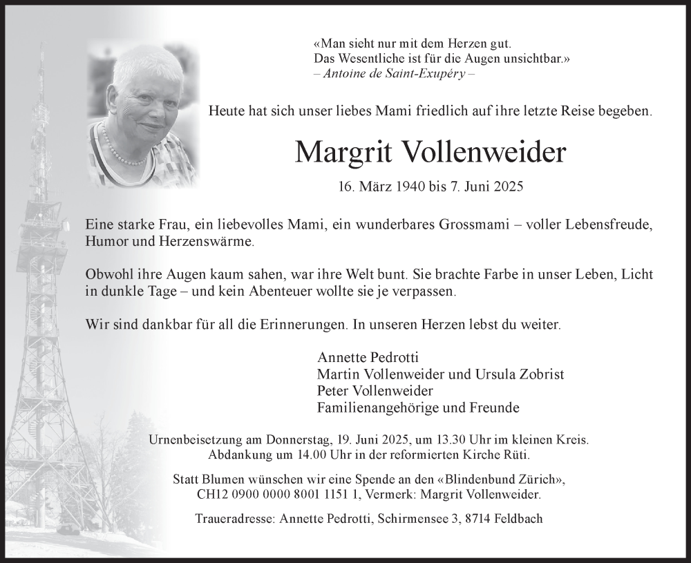 Hier finden Sie alle Traueranzeigen aus der Zeitung, die bisher für Margrit Vollenweider erschienen sind. Weitere Traueranzeigen, die in der Zeitung erscheinen, werden hier ebenfalls aufgelistet