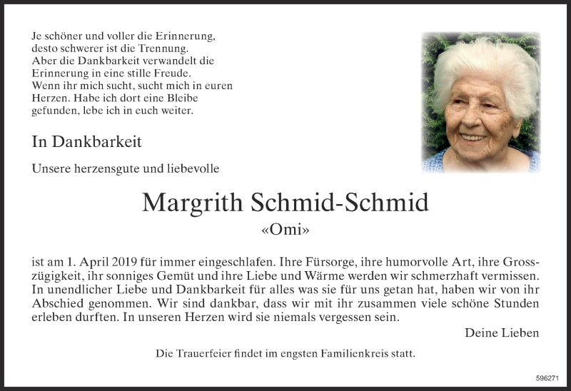 Hier finden Sie alle Traueranzeigen aus der Zeitung, die bisher für Margrith Schmid-Schmid erschienen sind. Weitere Traueranzeigen, die in der Zeitung erscheinen, werden hier ebenfalls aufgelistet