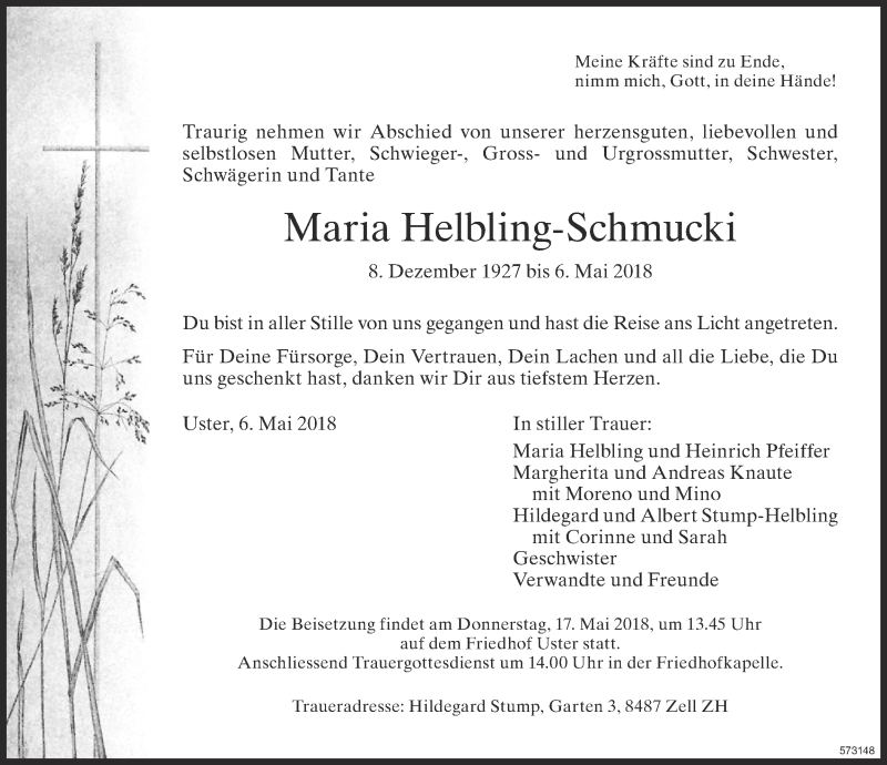 Hier finden Sie alle Traueranzeigen aus der Zeitung, die bisher für Maria Helbling-Schmucki erschienen sind. Weitere Traueranzeigen, die in der Zeitung erscheinen, werden hier ebenfalls aufgelistet