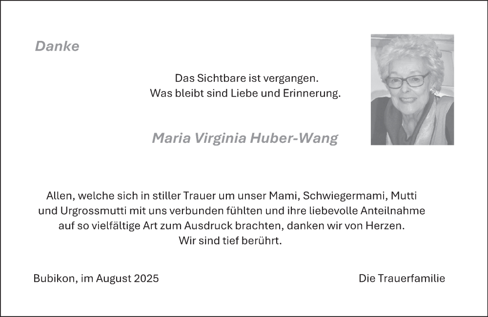 Hier finden Sie alle Traueranzeigen aus der Zeitung, die bisher für Maria Virginia Huber-Wang erschienen sind. Weitere Traueranzeigen, die in der Zeitung erscheinen, werden hier ebenfalls aufgelistet