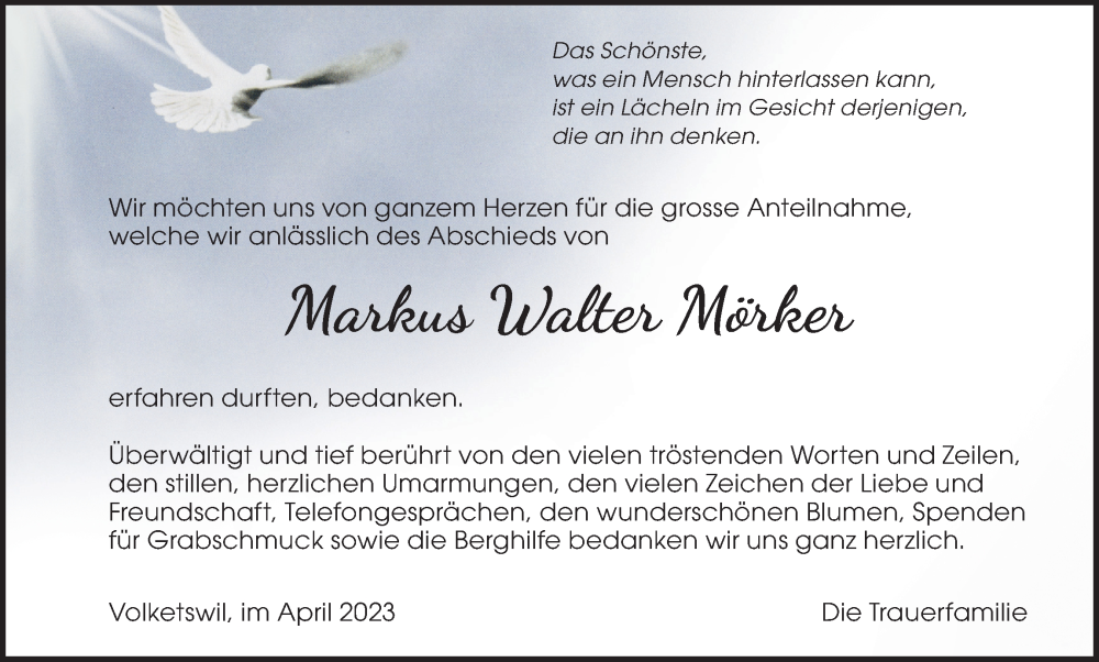 Hier finden Sie alle Traueranzeigen aus der Zeitung, die bisher für Markus Walter Mörker erschienen sind. Weitere Traueranzeigen, die in der Zeitung erscheinen, werden hier ebenfalls aufgelistet
