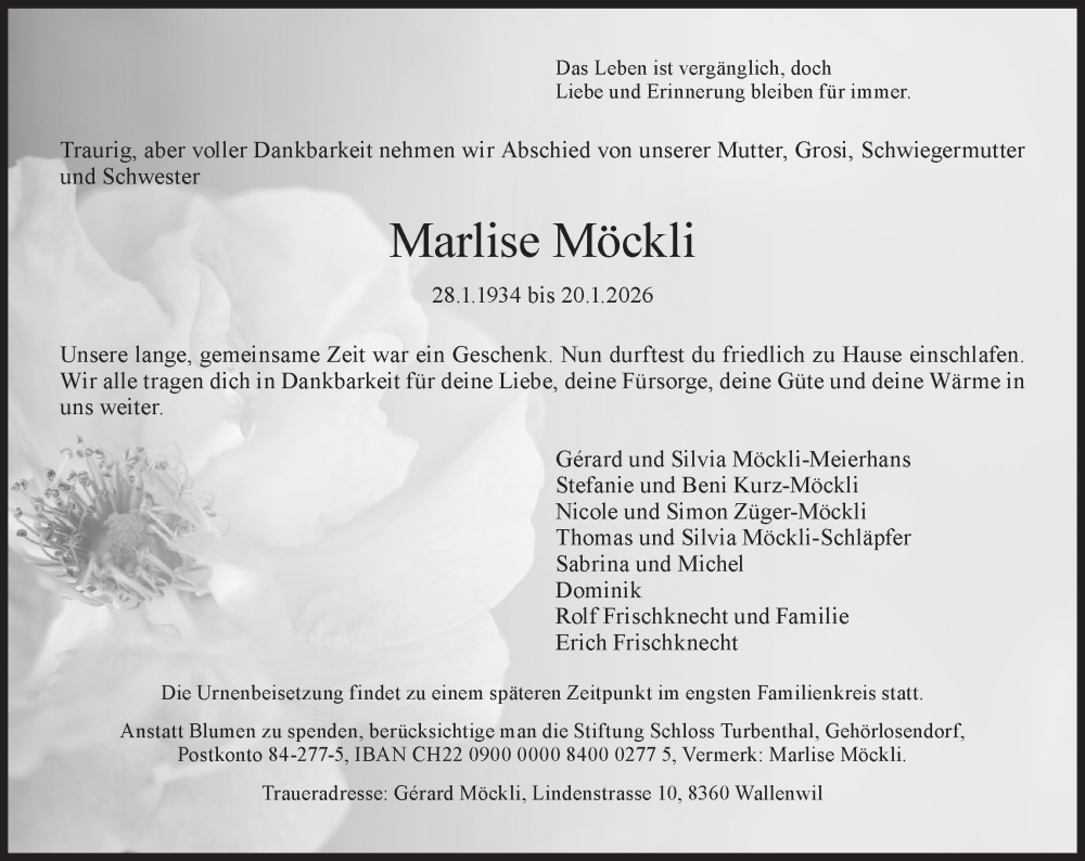 Hier finden Sie alle Traueranzeigen aus der Zeitung, die bisher für Marlise Möckli erschienen sind. Weitere Traueranzeigen, die in der Zeitung erscheinen, werden hier ebenfalls aufgelistet