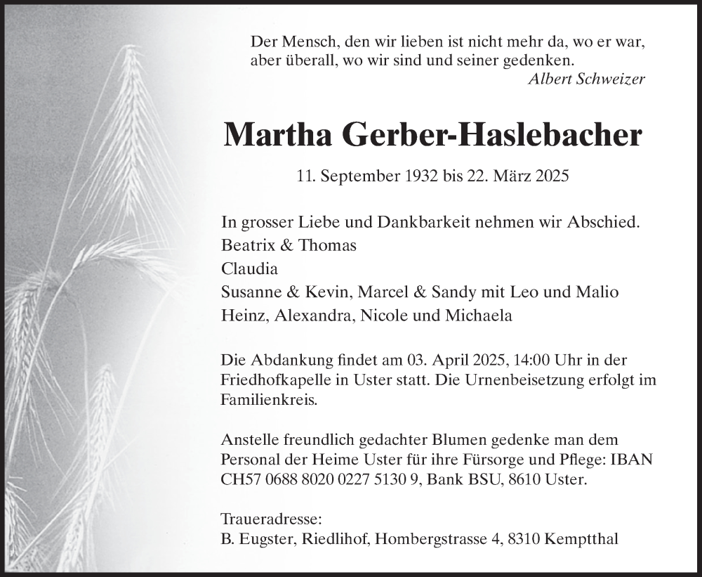 Hier finden Sie alle Traueranzeigen aus der Zeitung, die bisher für Martha Gerber-Haslebacher erschienen sind. Weitere Traueranzeigen, die in der Zeitung erscheinen, werden hier ebenfalls aufgelistet