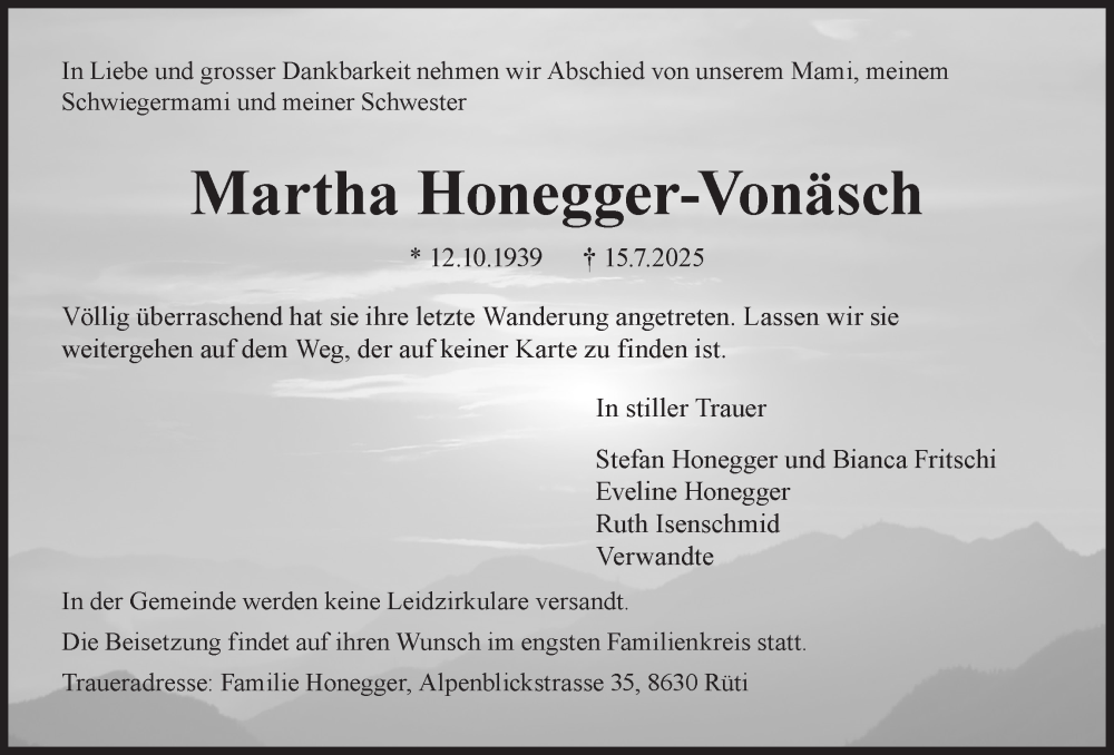 Hier finden Sie alle Traueranzeigen aus der Zeitung, die bisher für Martha Honegger erschienen sind. Weitere Traueranzeigen, die in der Zeitung erscheinen, werden hier ebenfalls aufgelistet