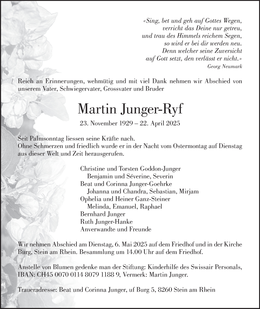 Hier finden Sie alle Traueranzeigen aus der Zeitung, die bisher für Martin Junger-Ryf erschienen sind. Weitere Traueranzeigen, die in der Zeitung erscheinen, werden hier ebenfalls aufgelistet