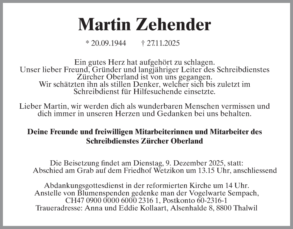 Hier finden Sie alle Traueranzeigen aus der Zeitung, die bisher für Martin Zehender erschienen sind. Weitere Traueranzeigen, die in der Zeitung erscheinen, werden hier ebenfalls aufgelistet