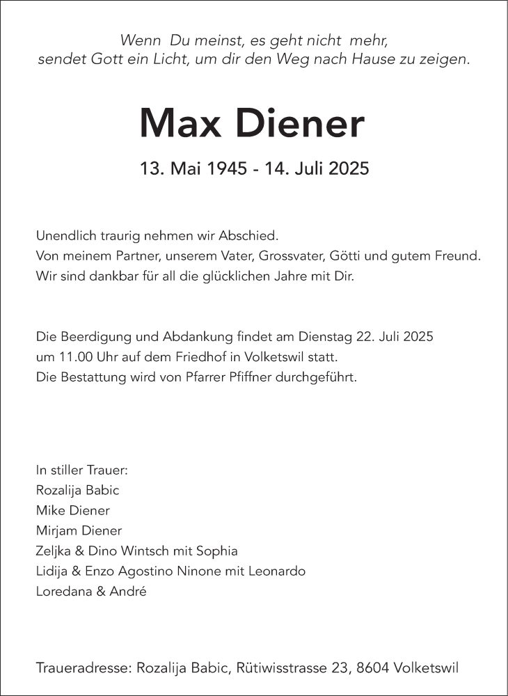 Hier finden Sie alle Traueranzeigen aus der Zeitung, die bisher für Max Diener erschienen sind. Weitere Traueranzeigen, die in der Zeitung erscheinen, werden hier ebenfalls aufgelistet