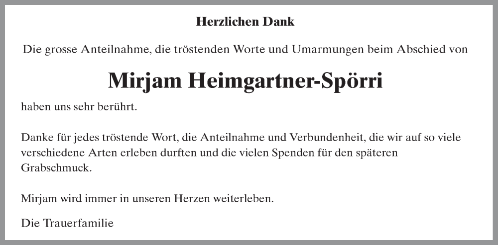 Hier finden Sie alle Traueranzeigen aus der Zeitung, die bisher für Mirjam Heimgartner-Spörri erschienen sind. Weitere Traueranzeigen, die in der Zeitung erscheinen, werden hier ebenfalls aufgelistet