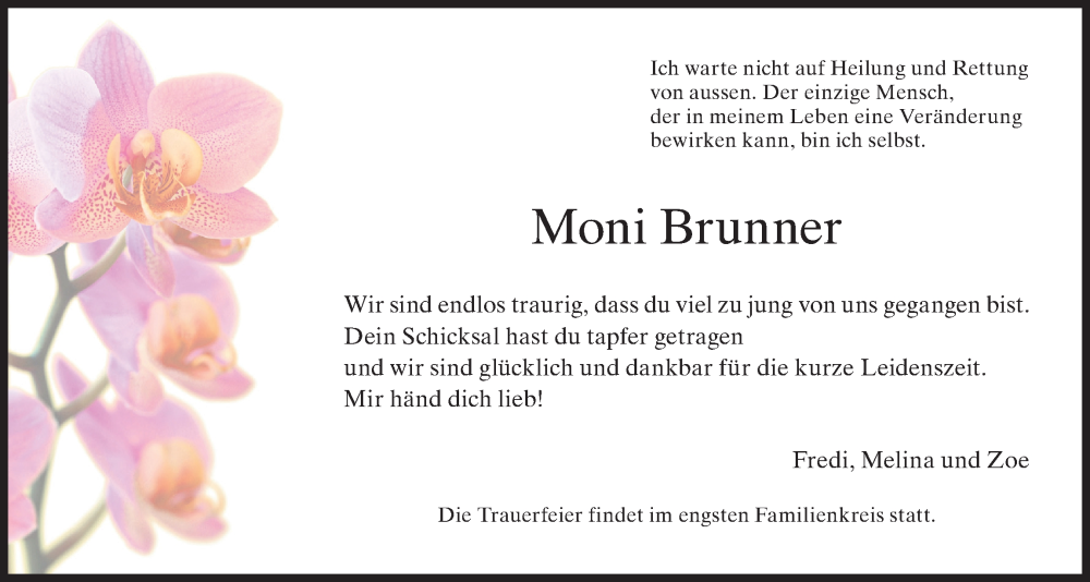 Hier finden Sie alle Traueranzeigen aus der Zeitung, die bisher für Moni Brunner erschienen sind. Weitere Traueranzeigen, die in der Zeitung erscheinen, werden hier ebenfalls aufgelistet