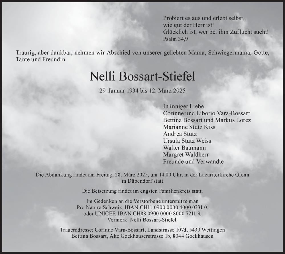 Hier finden Sie alle Traueranzeigen aus der Zeitung, die bisher für Nelli Bossart erschienen sind. Weitere Traueranzeigen, die in der Zeitung erscheinen, werden hier ebenfalls aufgelistet