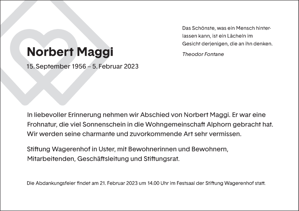 Hier finden Sie alle Traueranzeigen aus der Zeitung, die bisher für Norbert Maggi erschienen sind. Weitere Traueranzeigen, die in der Zeitung erscheinen, werden hier ebenfalls aufgelistet
