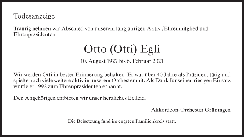 Hier finden Sie alle Traueranzeigen aus der Zeitung, die bisher für Otto Egli erschienen sind. Weitere Traueranzeigen, die in der Zeitung erscheinen, werden hier ebenfalls aufgelistet