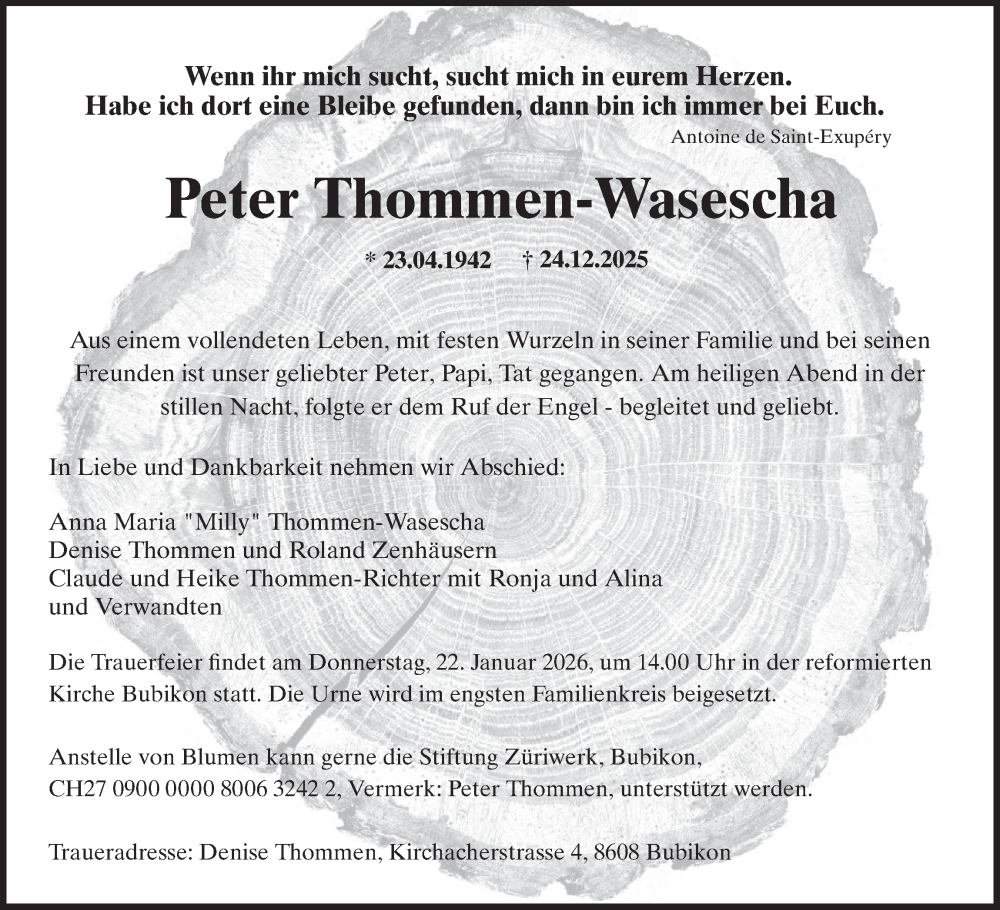 Hier finden Sie alle Traueranzeigen aus der Zeitung, die bisher für Peter Thommen-Wasescha erschienen sind. Weitere Traueranzeigen, die in der Zeitung erscheinen, werden hier ebenfalls aufgelistet