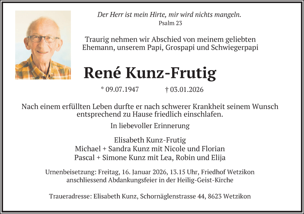 Hier finden Sie alle Traueranzeigen aus der Zeitung, die bisher für René Kunz-Frutig erschienen sind. Weitere Traueranzeigen, die in der Zeitung erscheinen, werden hier ebenfalls aufgelistet