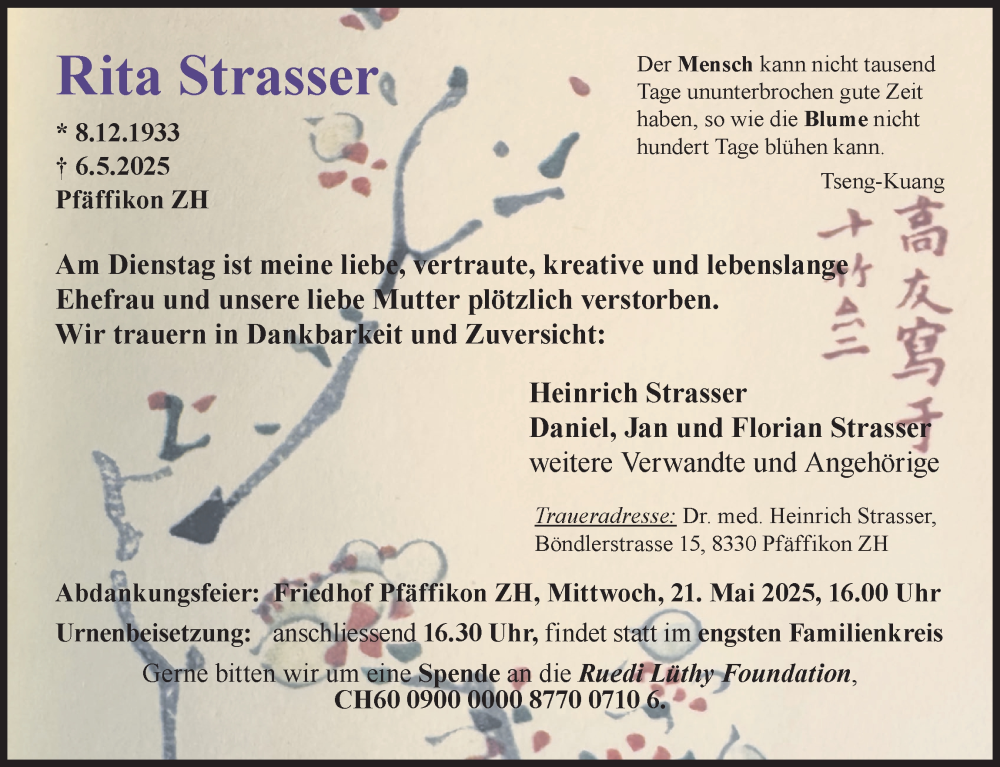 Hier finden Sie alle Traueranzeigen aus der Zeitung, die bisher für Rita Strasser erschienen sind. Weitere Traueranzeigen, die in der Zeitung erscheinen, werden hier ebenfalls aufgelistet