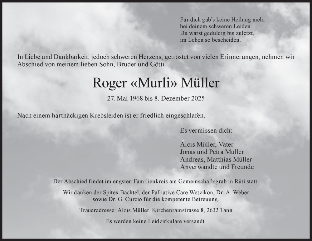 Hier finden Sie alle Traueranzeigen aus der Zeitung, die bisher für Roger Müller erschienen sind. Weitere Traueranzeigen, die in der Zeitung erscheinen, werden hier ebenfalls aufgelistet