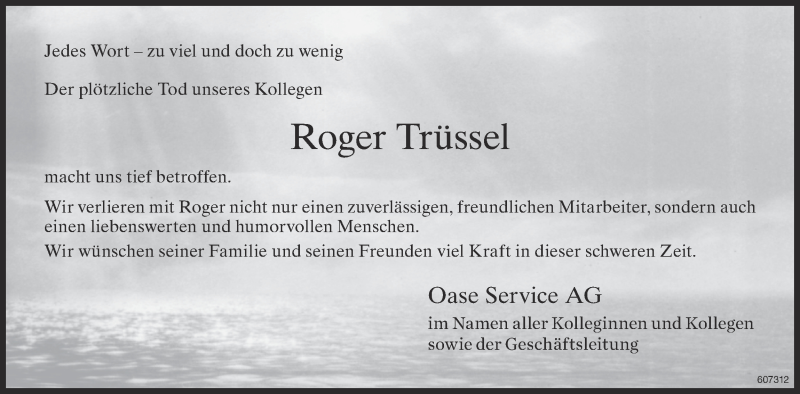 Hier finden Sie alle Traueranzeigen aus der Zeitung, die bisher für Roger Trüssel erschienen sind. Weitere Traueranzeigen, die in der Zeitung erscheinen, werden hier ebenfalls aufgelistet