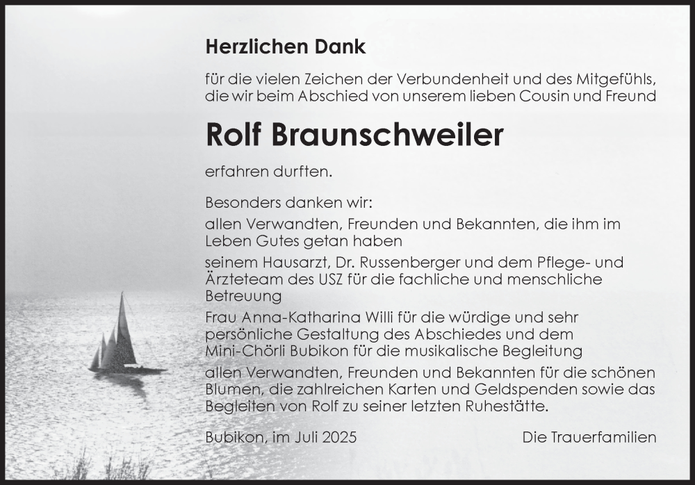 Hier finden Sie alle Traueranzeigen aus der Zeitung, die bisher für Rolf Braunschweiler erschienen sind. Weitere Traueranzeigen, die in der Zeitung erscheinen, werden hier ebenfalls aufgelistet