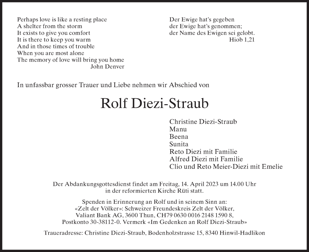 Hier finden Sie alle Traueranzeigen aus der Zeitung, die bisher für Rolf Diezi-Straub erschienen sind. Weitere Traueranzeigen, die in der Zeitung erscheinen, werden hier ebenfalls aufgelistet