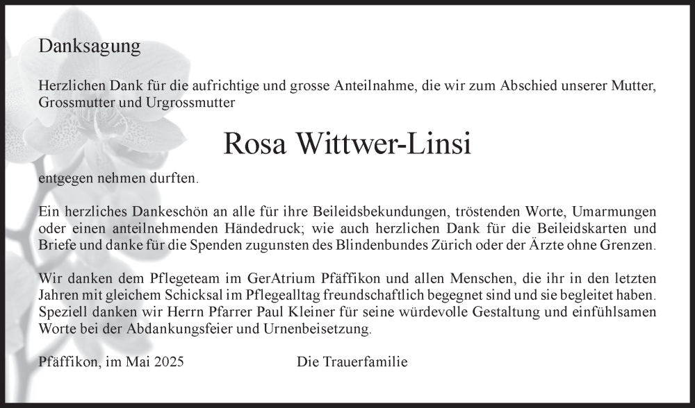 Hier finden Sie alle Traueranzeigen aus der Zeitung, die bisher für Rosa Wittwer erschienen sind. Weitere Traueranzeigen, die in der Zeitung erscheinen, werden hier ebenfalls aufgelistet