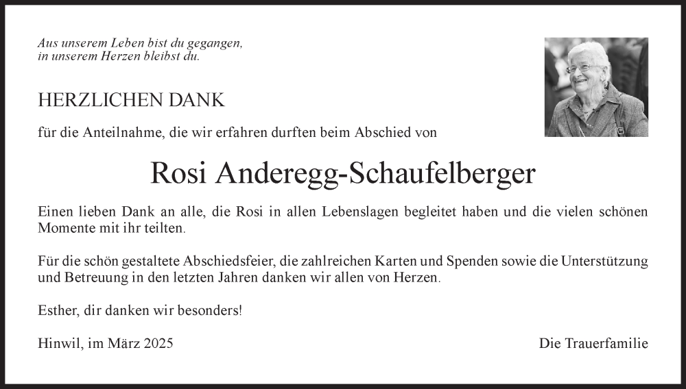 Hier finden Sie alle Traueranzeigen aus der Zeitung, die bisher für Rosi Anderegg-Schaufelberger erschienen sind. Weitere Traueranzeigen, die in der Zeitung erscheinen, werden hier ebenfalls aufgelistet