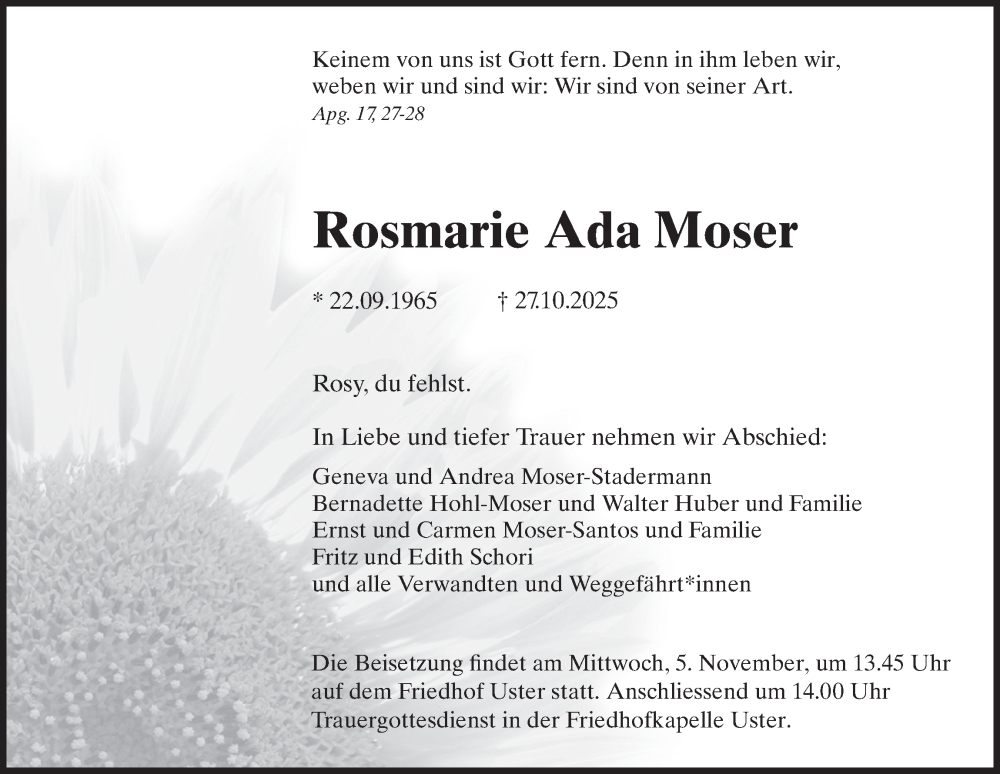 Hier finden Sie alle Traueranzeigen aus der Zeitung, die bisher für Rosmarie Ada Moser erschienen sind. Weitere Traueranzeigen, die in der Zeitung erscheinen, werden hier ebenfalls aufgelistet