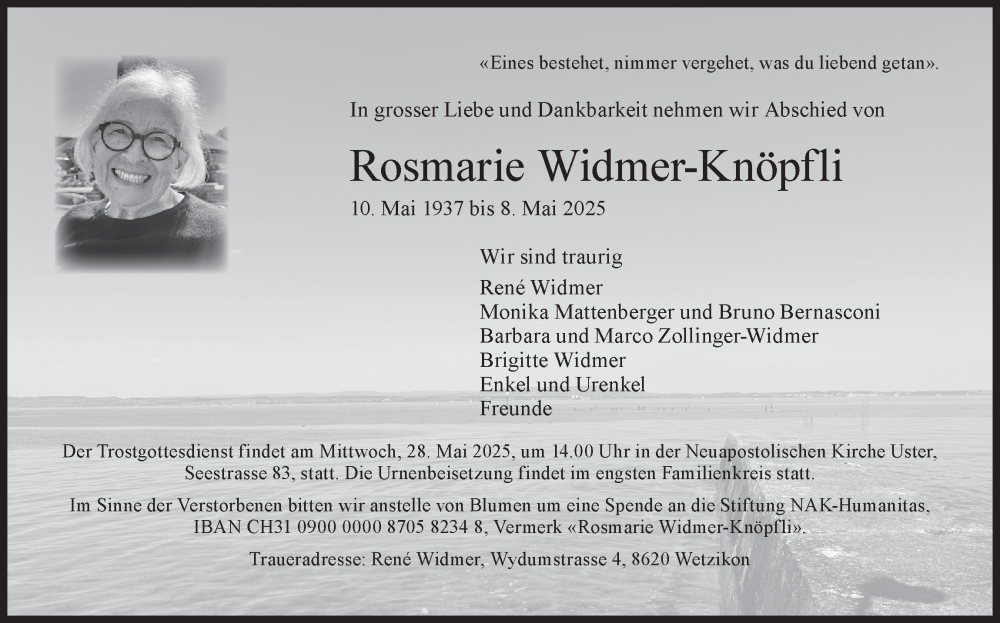 Hier finden Sie alle Traueranzeigen aus der Zeitung, die bisher für Rosmarie Widmer-Knöpfli erschienen sind. Weitere Traueranzeigen, die in der Zeitung erscheinen, werden hier ebenfalls aufgelistet
