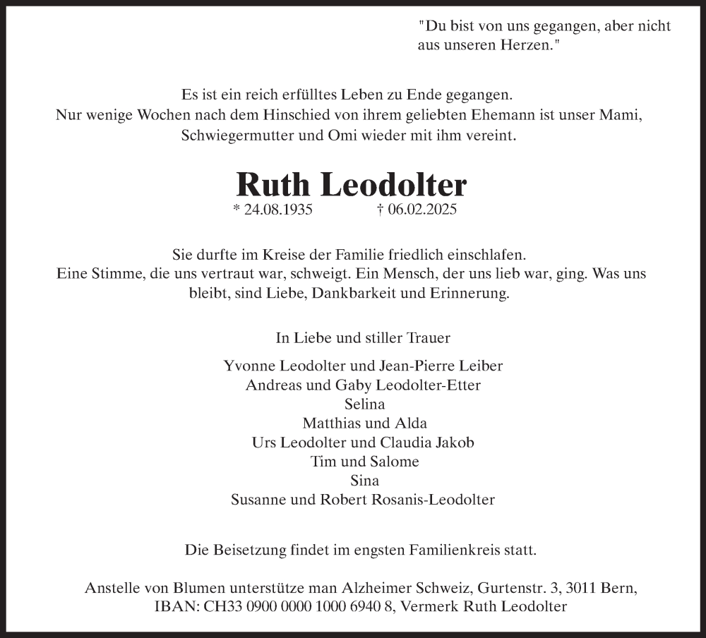 Hier finden Sie alle Traueranzeigen aus der Zeitung, die bisher für Ruth Leodolter erschienen sind. Weitere Traueranzeigen, die in der Zeitung erscheinen, werden hier ebenfalls aufgelistet