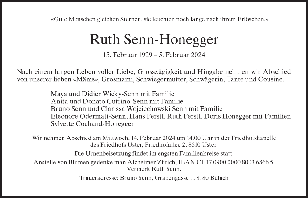 Hier finden Sie alle Traueranzeigen aus der Zeitung, die bisher für Ruth Senn-Honegger erschienen sind. Weitere Traueranzeigen, die in der Zeitung erscheinen, werden hier ebenfalls aufgelistet