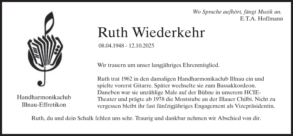 Hier finden Sie alle Traueranzeigen aus der Zeitung, die bisher für Ruth Wiederkehr erschienen sind. Weitere Traueranzeigen, die in der Zeitung erscheinen, werden hier ebenfalls aufgelistet