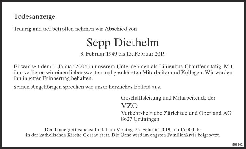 Hier finden Sie alle Traueranzeigen aus der Zeitung, die bisher für Sepp Diethelm erschienen sind. Weitere Traueranzeigen, die in der Zeitung erscheinen, werden hier ebenfalls aufgelistet