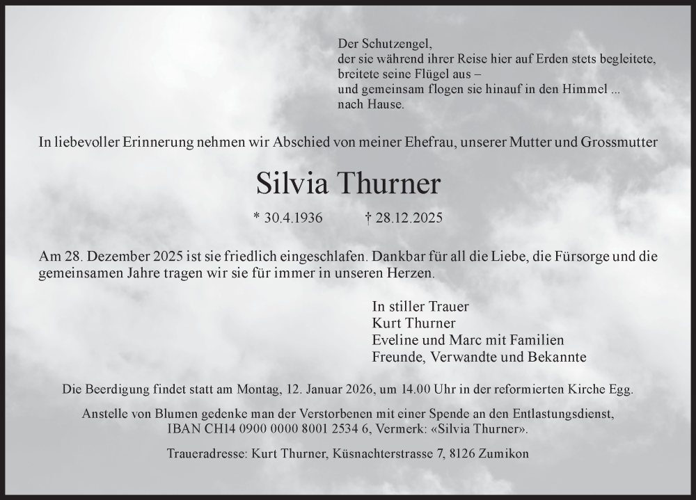 Hier finden Sie alle Traueranzeigen aus der Zeitung, die bisher für Silvia Thurner erschienen sind. Weitere Traueranzeigen, die in der Zeitung erscheinen, werden hier ebenfalls aufgelistet