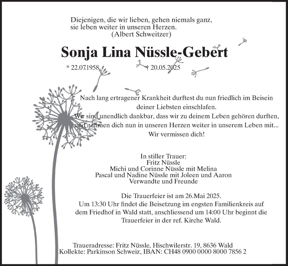 Hier finden Sie alle Traueranzeigen aus der Zeitung, die bisher für Sonja Lina Nüssle-Gebert erschienen sind. Weitere Traueranzeigen, die in der Zeitung erscheinen, werden hier ebenfalls aufgelistet