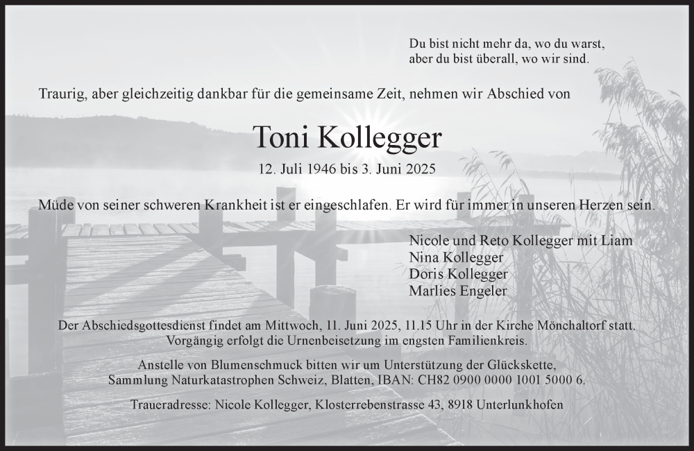 Hier finden Sie alle Traueranzeigen aus der Zeitung, die bisher für Toni Kollegger erschienen sind. Weitere Traueranzeigen, die in der Zeitung erscheinen, werden hier ebenfalls aufgelistet
