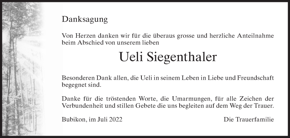 Hier finden Sie alle Traueranzeigen aus der Zeitung, die bisher für Ueli Siegenthaler erschienen sind. Weitere Traueranzeigen, die in der Zeitung erscheinen, werden hier ebenfalls aufgelistet