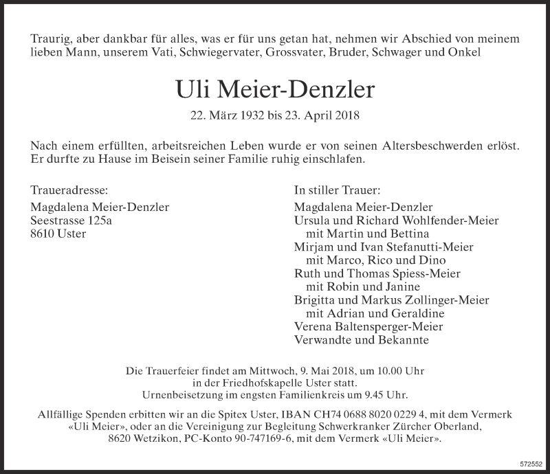 Hier finden Sie alle Traueranzeigen aus der Zeitung, die bisher für Uli Meier-Denzler erschienen sind. Weitere Traueranzeigen, die in der Zeitung erscheinen, werden hier ebenfalls aufgelistet