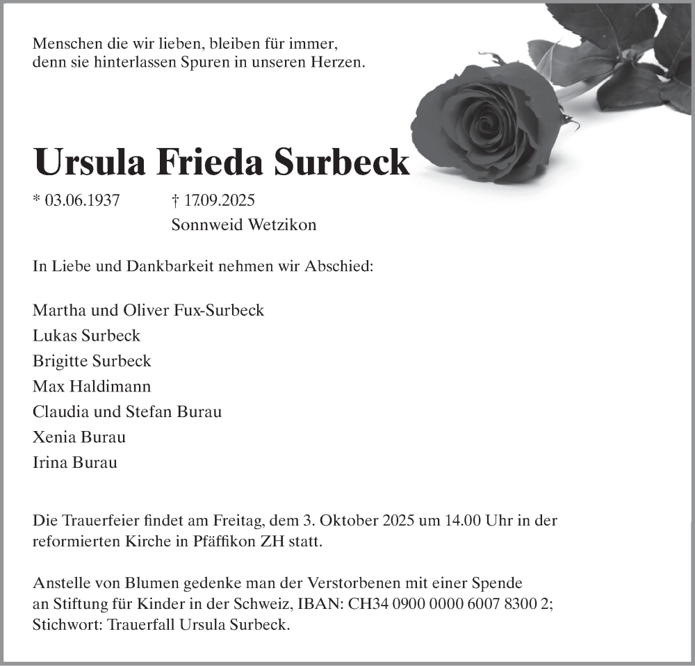 Hier finden Sie alle Traueranzeigen aus der Zeitung, die bisher für Ursula Frieda Surbeck erschienen sind. Weitere Traueranzeigen, die in der Zeitung erscheinen, werden hier ebenfalls aufgelistet