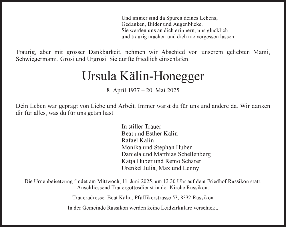 Hier finden Sie alle Traueranzeigen aus der Zeitung, die bisher für Ursula Kälin-Honegger erschienen sind. Weitere Traueranzeigen, die in der Zeitung erscheinen, werden hier ebenfalls aufgelistet