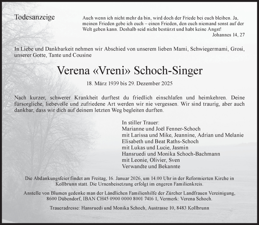 Hier finden Sie alle Traueranzeigen aus der Zeitung, die bisher für Verena Schoch-Singer erschienen sind. Weitere Traueranzeigen, die in der Zeitung erscheinen, werden hier ebenfalls aufgelistet
