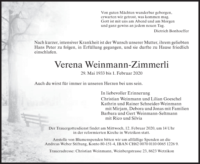 Hier finden Sie alle Traueranzeigen aus der Zeitung, die bisher für Verena Weinmann-Zimmerli erschienen sind. Weitere Traueranzeigen, die in der Zeitung erscheinen, werden hier ebenfalls aufgelistet
