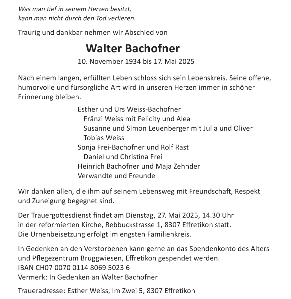 Hier finden Sie alle Traueranzeigen aus der Zeitung, die bisher für Walter Bachofner erschienen sind. Weitere Traueranzeigen, die in der Zeitung erscheinen, werden hier ebenfalls aufgelistet