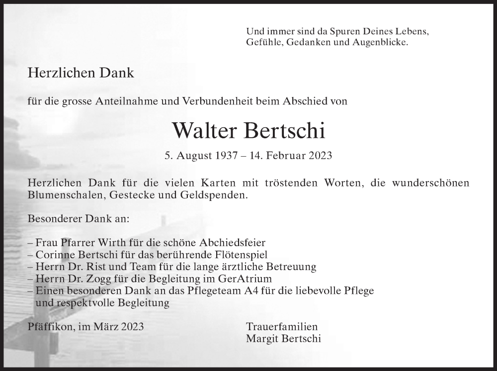 Hier finden Sie alle Traueranzeigen aus der Zeitung, die bisher für Walter Bertschi erschienen sind. Weitere Traueranzeigen, die in der Zeitung erscheinen, werden hier ebenfalls aufgelistet