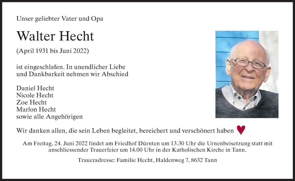 Hier finden Sie alle Traueranzeigen aus der Zeitung, die bisher für Walter Hecht erschienen sind. Weitere Traueranzeigen, die in der Zeitung erscheinen, werden hier ebenfalls aufgelistet