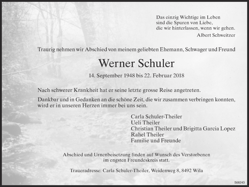 Hier finden Sie alle Traueranzeigen aus der Zeitung, die bisher für Werner Schuler erschienen sind. Weitere Traueranzeigen, die in der Zeitung erscheinen, werden hier ebenfalls aufgelistet